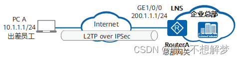 如图1所示,某企业使用RouterA作为总部网关。企业的出差员工用PC A通过L2TP拨号与总部建立通信。为了保证出差员工接入内网的安全性,企业希望在出差员工和总部网关之间建立一个IPSec隧道。