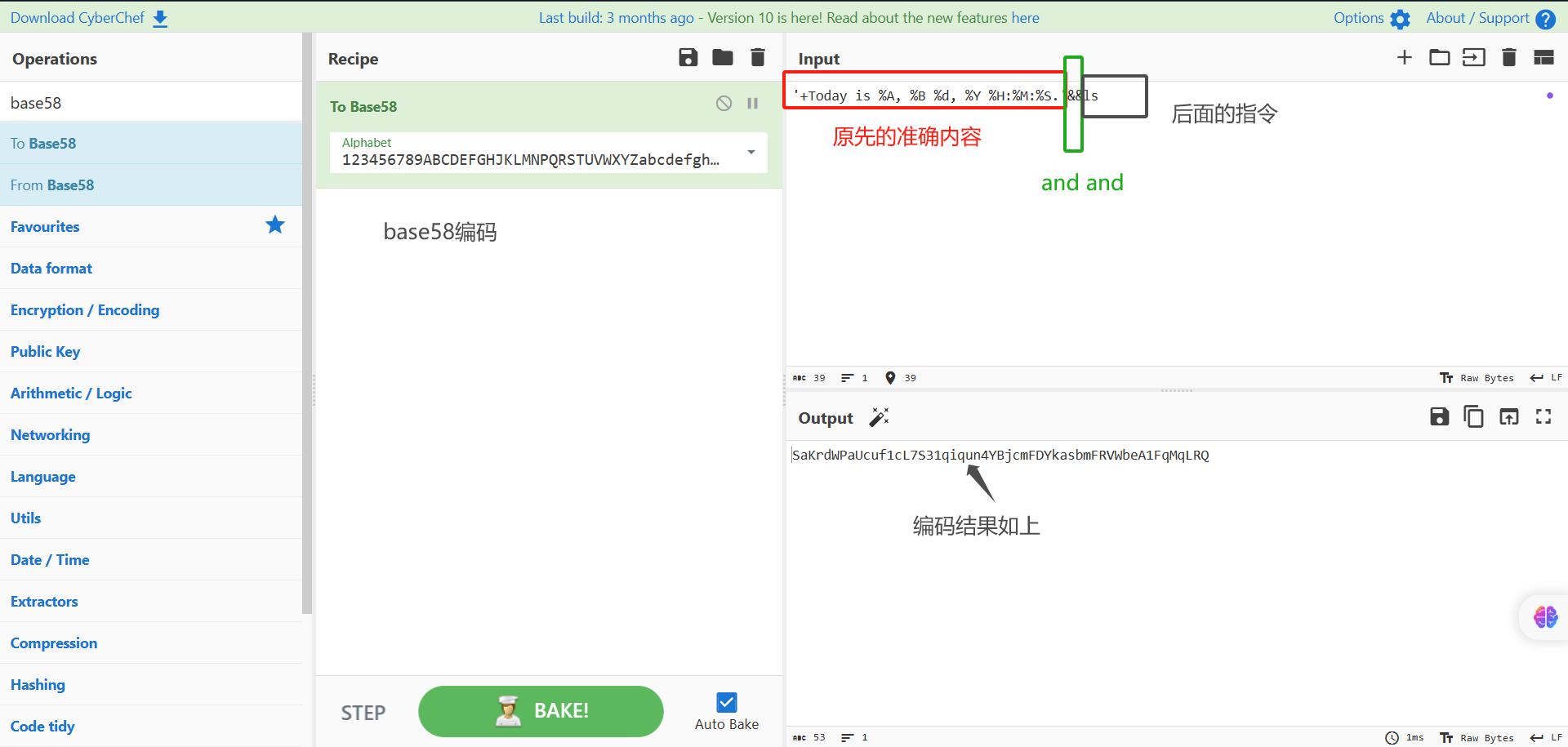 因此可以尝试在前面输入准确的情况下执行后面的指令,即用&&尝试,需要注意的是需要进行base58编码才行