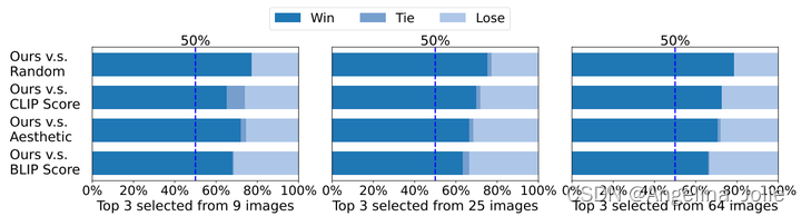 人类评测。为了评估ImageReward在大量生成的图片中选出最受人类偏好图片的能力,我们构建了另一个数据集,从DiffusionDB中收集同一个prompt下对应的9/25/64张生成图片,并使用包括ImageReward在内的不同方法从这些图片中分别选择top3的结果。标注者对这些top3图片进行排序,上图显示了ImageReward的胜率。ImageReward可以选择与文本更对齐、保真度更高的图像,并避免有毒内容。