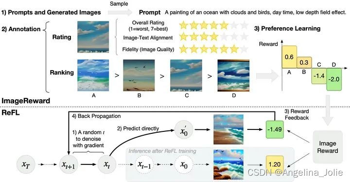 ImageReward和ReFL的概览。(上)ImageReward的标注和训练,包括数据收集、标注和偏好学习。(下)ReFL利用ImageReward的反馈直接优化后随机去噪步骤的扩散模型