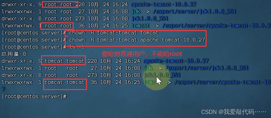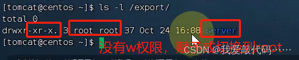 查看原因发现没有w权限,因为他的用户和用户组都是root,tomcat既不是root用户也不是root用户组,没权限,切换到root,或chmod赋予权限