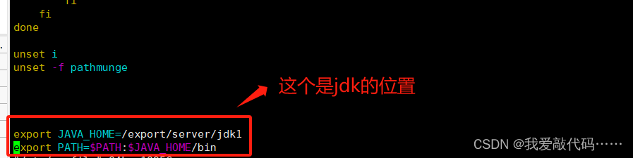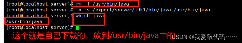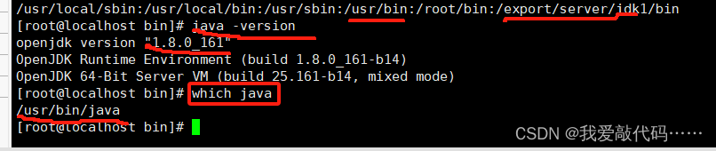 12.通过which java ,发现这个java不在自己建立的文件中,系统自带的Java在/usr/bin中,自己下载的java在/export/server/jdk中,这个/usr/bin文件在/export/server的前面,我用红线标注了,path在搜的时候搜到的前面的,就会停止搜索,所以这个版本就是系统自带的版本