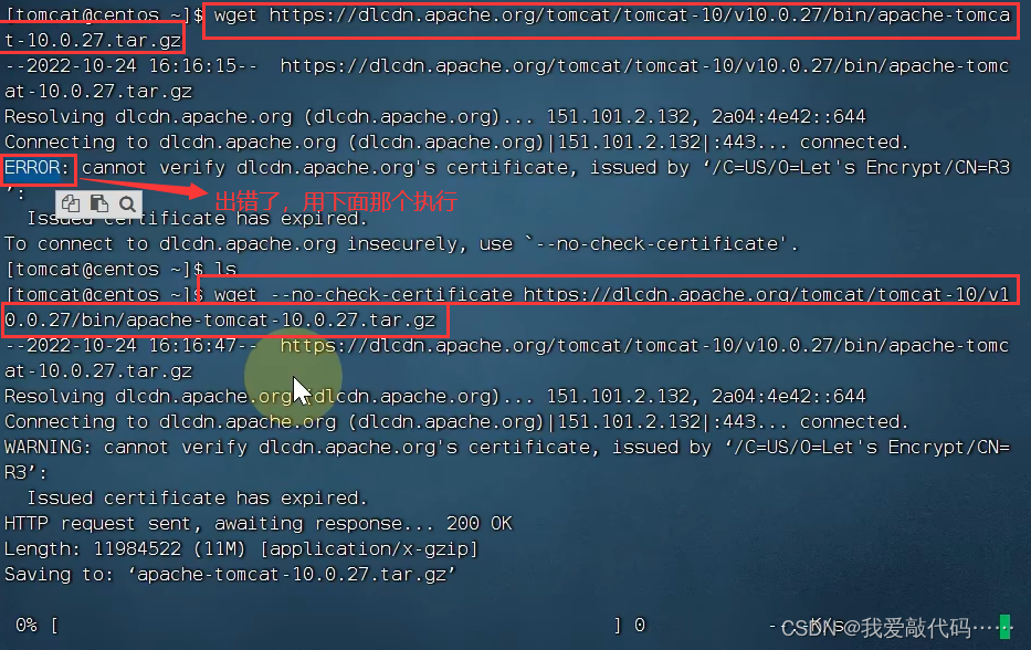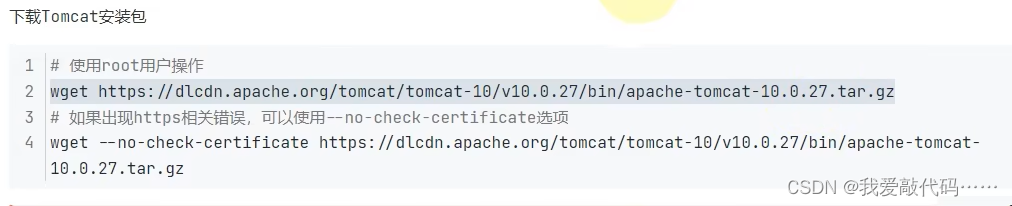 wget --no-check-certificate https://dlcdn.apache.org/tomcat/tomcat-10/v10.0.27/bin/apache-tomcat-10.0.27.tar.gz