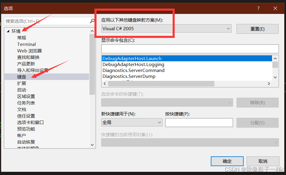 2、进入选项界面后点击环境——>再点击键盘,我们可用看到右边的界面的映射方案是VisualC#2005
