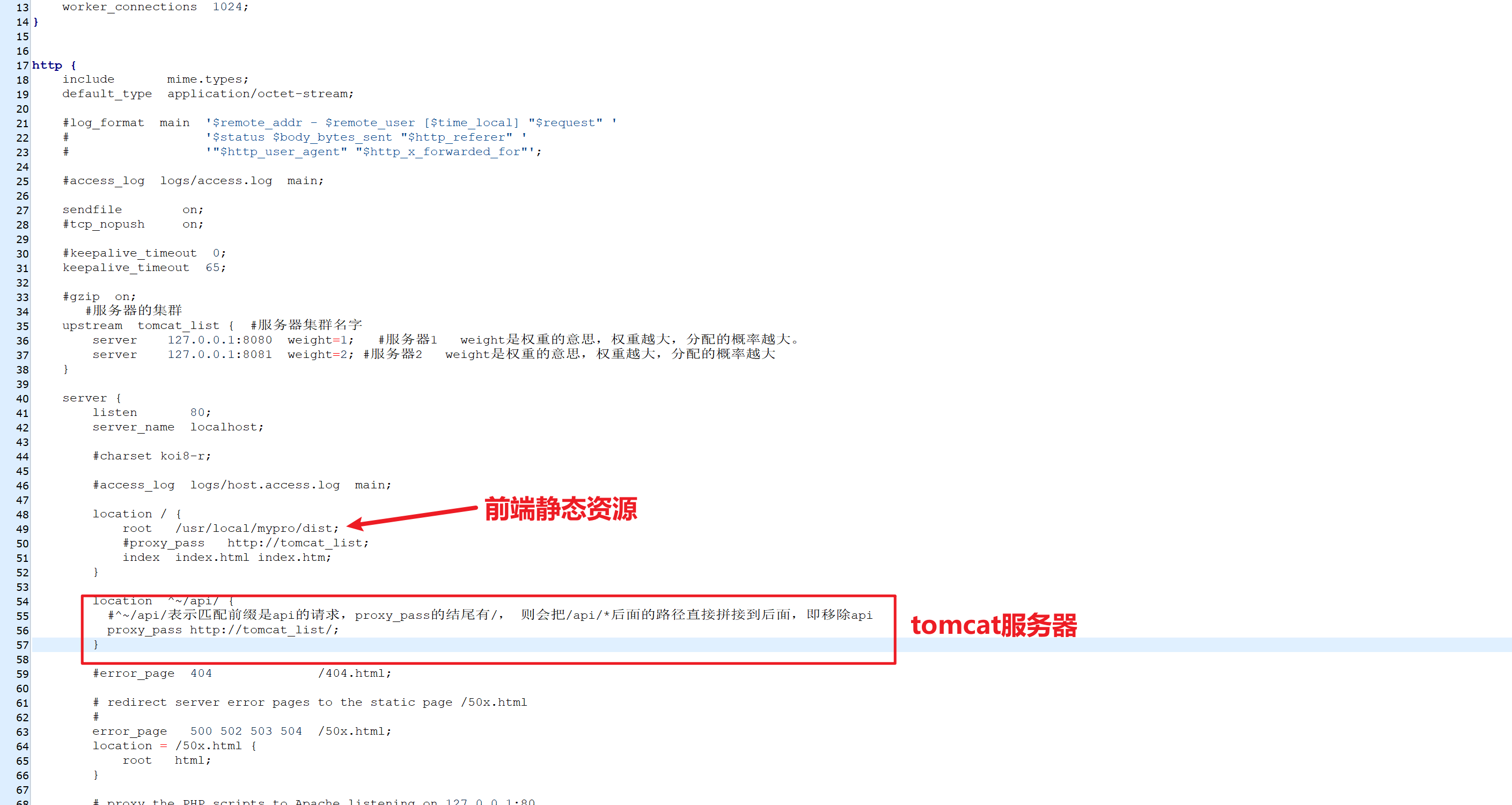 - #^~/api/表示匹配前缀是api的请求,proxy_pass的结尾有/, 则会把/api/*后面的路径直接拼接到后面,即移除api