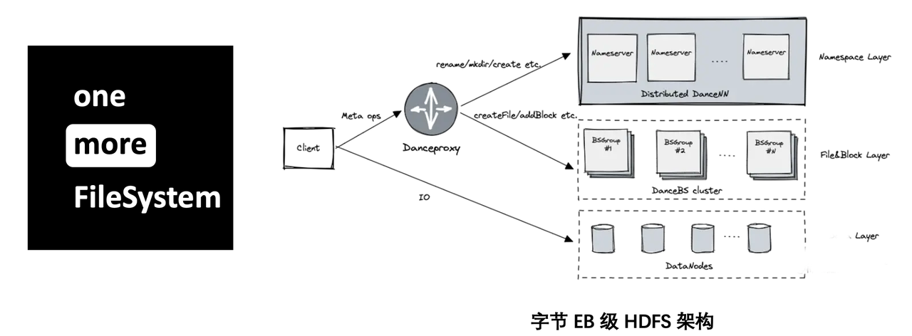 基于字节内部业务对以上存储加速能力的需求,我们推出了一个新的、从字节内部 HDFS 演进而来的 File System 服务,命名为 CloudFS。CloudFS 的整体技术架构与内部 HDFS 架构本质上是同一套组件在云上做的一些产品化、小型化和多租户的封装。