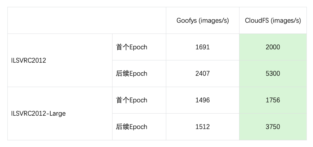 第二部分的测试是基于这个数据集已经运行了一些简单的基于学习训练的任务负载后,与 Goofys 做了一个对比,无论是在 Epoch 缓存是否命中的场景都会对性能有比较大的提升。只是因为第一个 Epoch 是从底层存储上拿到的,所以性能提升不是很明显,到缓存全部命中之后就会有两倍多的能力提升。