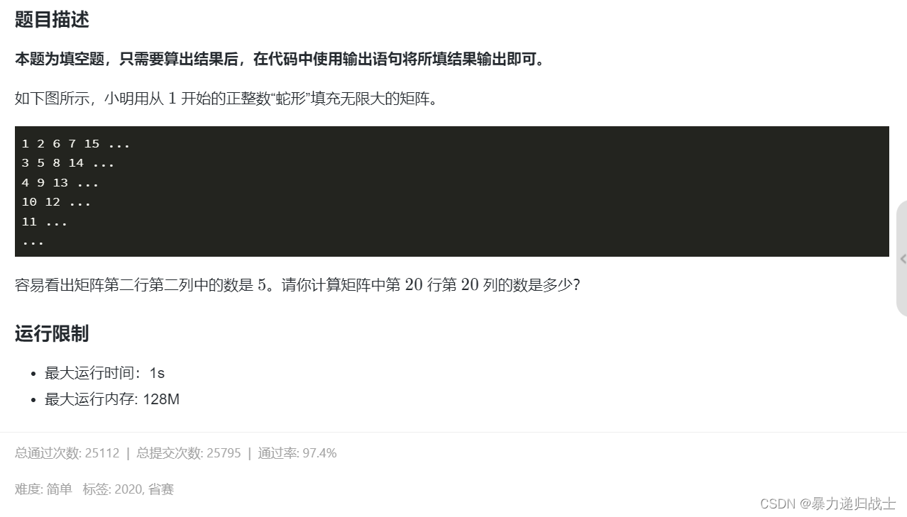 设i为某个数所在行,j为某个数所在列。(i+j)为偶数时,蛇形矩阵往右上方走,(i+j)为奇数时,蛇形矩阵往左下方走。(20+20)为偶数,往右上方走。所以mat[20][20]=mat[39][1]+19=mat[38][1]+20=1+2+...+38+20;