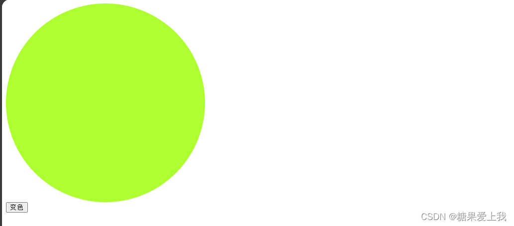 html> <html lang="en"> <head> <meta charset="UTF-8"> <title>Titletitle> <meta name="viewport" content="width=device-width, initial-scale=1"> <style> .c1 { height: 400px; width: 400px; border-radius: 50%; } .bg_green { background-color: greenyellow; } .bg_red { background-color: red; } style> head> <body> <div id="d1" class="c1 bg_red bg_green">div> <button id="d2">变色button> <script> let btnEle = document.getElementById('d2') let divEle = document.getElementById('d1') btnEle.onclick = function () { // 绑定点击事件 // 动态的修改div标签的类属性 divEle.classList.toggle('bg_red') } script> body> html>
