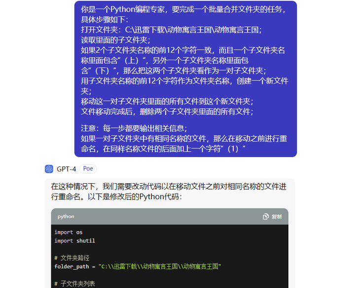 想要把这些能够配对的子文件夹进行合并,怎么利用ChatGPT来操作呢?