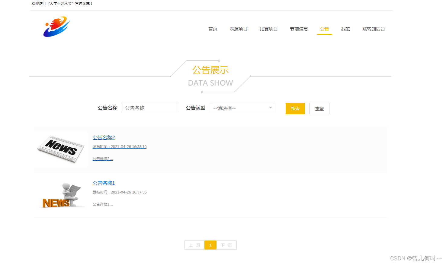 管理员进入指定功能操作区之后可以管理表演项目报名信息。其页面见下图。管理员查看用户参与报名的表演项目信息。