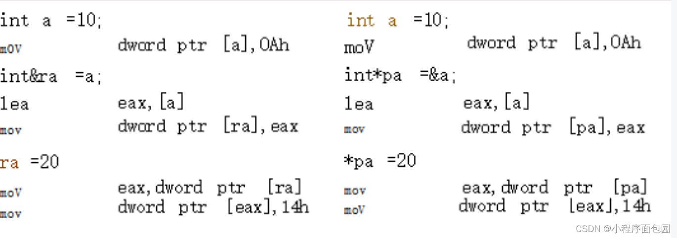 下面是引用和指针的汇编,我们会发现引用的底层和指针的操作是一模一样的,但是在语法角度他们有区别,因为引用不是对象,不会开空间,但是指针是对象,会开空间;在底层的角度又没有区别,都是指针,所以,这里我们以语法为准
