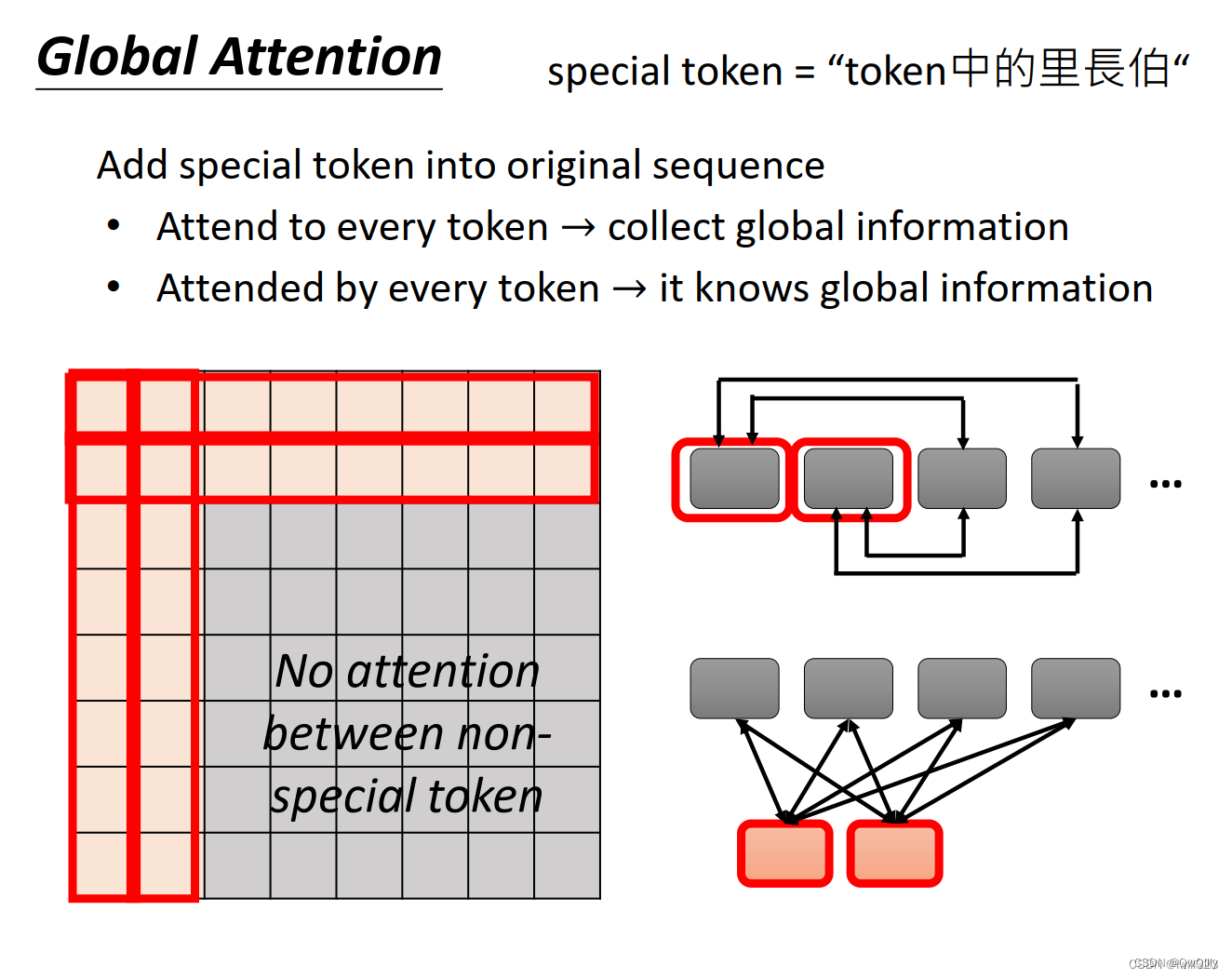选择sequence中的某些token作为special token(比如开头的token,标点符号),或者在原始的sequence中增加special token。让special token与sequence里每一个token产生关系(Attend to every token和Attended by every token),但其他不是special token的token之间没有attention。