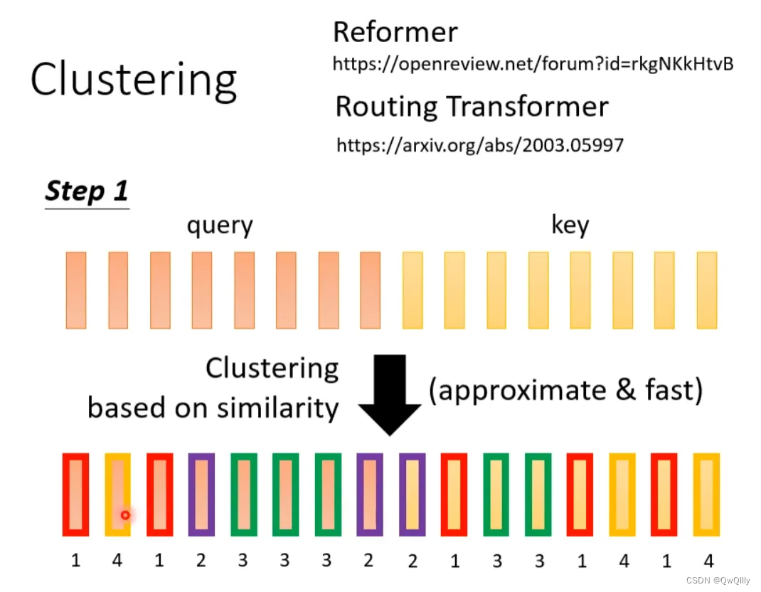 下面这两个文献中给出一种Clustering(聚类)的方案,即对query和key进行聚类,属于同一类的query和key来计算attention,不属于同一类的就不参与计算,这样就可以加快Attention Matrix的计算。比如下面这个例子中,分为4类:1(红框)、2(紫框)、3(绿框)、4(黄框)。在下面两个文献中介绍了可以快速粗略聚类的方法。