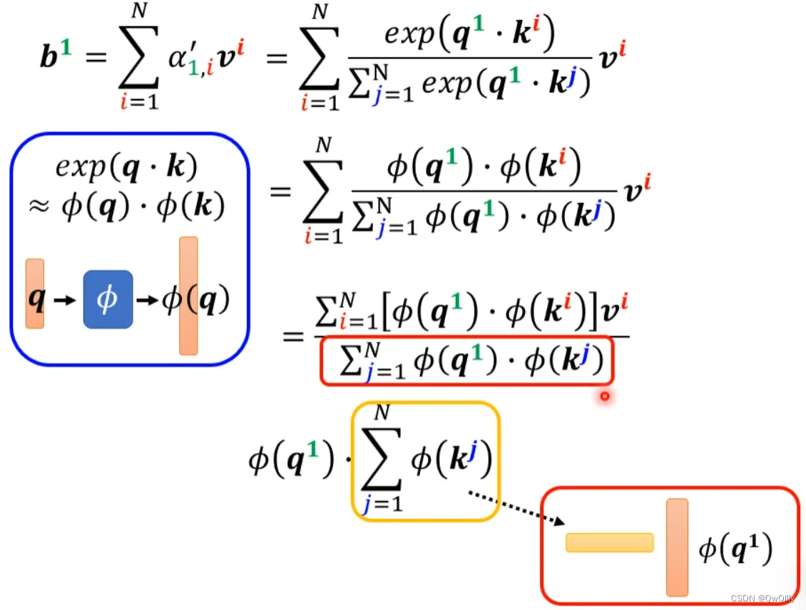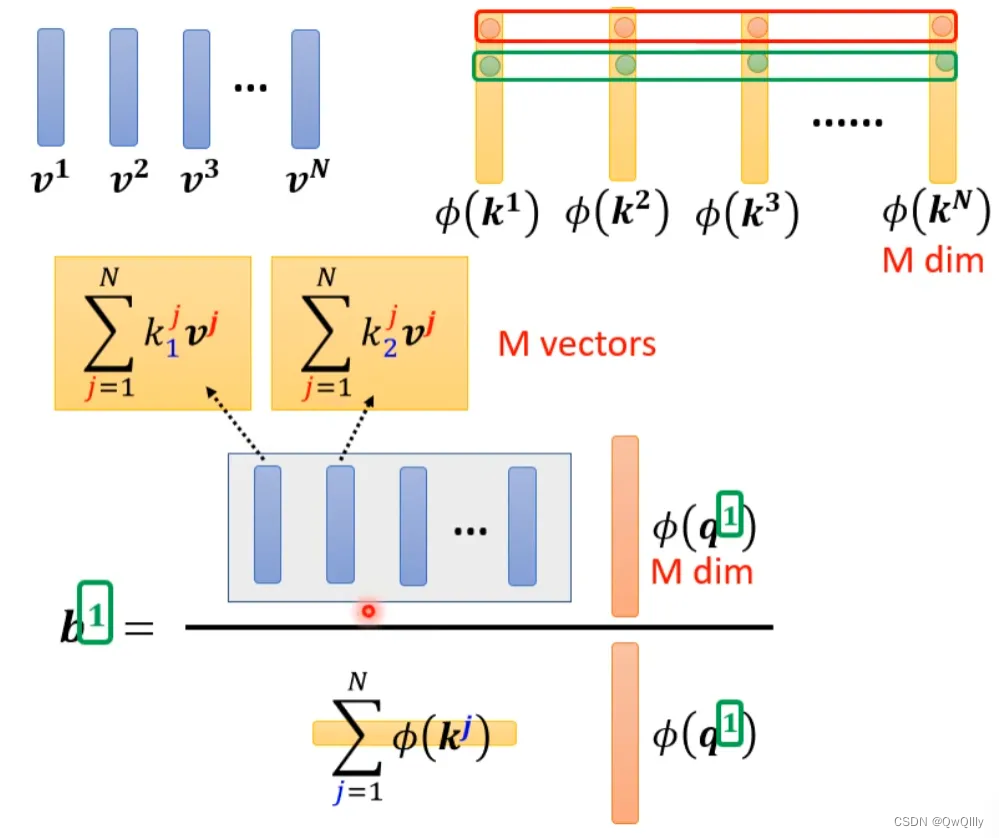 self-attention还可以用另一种方法来看待。这个计算的方法跟原来的self-attention计算出的结果几乎一样,但是运算量会大幅度减少。简单来说,先找到一个转换的方式φ(),对k进行转换得到M维向量φ(k),然后φ(k)跟v做weighted sum点乘得到M vectors。再对q做转换,φ(q)每个元素跟M vectors做weighted sum点乘,得到一个向量,即是b的分子。