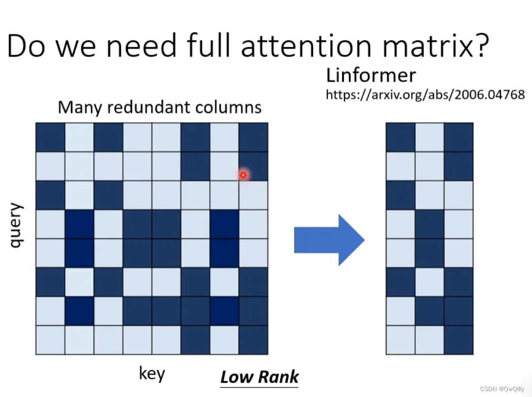 在self-attention中,假设输入序列(query)长度是N,为了捕捉每个value或者token之间的关系,需要产生N个key与之对应,并将query与key之间做dot-product,就可以产生一个Attention Matrix(注意力矩阵),维度N*N。
