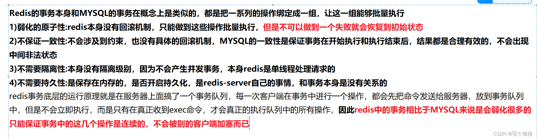 原子性最初的含义是:是将多个操作打包到一起,要么全都执行成功,要么全都不执行,redis做到了上述的含义,但是MYSQL这里面的原子性走得更远,也是把多个操作打包到一起,要么全部执行正确,要么执行失败全都回滚回去,就是把中间执行的操作,全部进行回退;