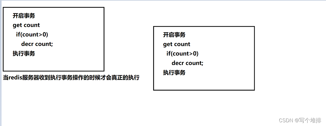 1)当第二个客户端的执行事务命令发送过来以后,服务器才真正的执行第二个事务里面的内容,此时第一个事务执行完成事务命令已经运行过了,此时第二个事务get到的count就已经是第一个事务自减以后的结果了,实际上在这个过程没加锁,也可以解决问题