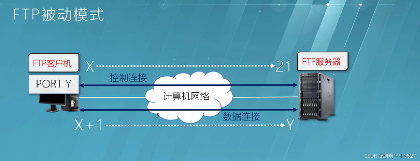 在FTP被动方式中,控制连接的建立方法与主动方式相同,而数据连接的建立则不同。当需要传输数据时,客户端通过控制连接向服务器发送PASV命令,服务器收到PASV命令后选择一个动态端口y,并通过PORT命令将选择的动态端口y告诉客户端,向客户端使用本地动态端口x+1,向服务器的动态端口y发起TCP连接建立请求,经过TCP三次握手,在客户端端口x+1与服务器端口y之间建立起数据连接,用作传输数据。由此可以看出,数据连接是由客户端主动发起的,而服务器是被动接收连接,因此称为被动方式。