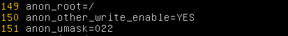 /etc/vsftpd.conf(部分Linux系统是/etc/vsftpd/vsftpd.conf文件)结尾追加三行anon_root=/、anon_other_write_enable=YES和anon_umask=022。同时将anon_upload_enable=YES、write_enable=YES和anon_mkdir_write_enable=YES前的#符号删除,并将anonymous_enable设置为YES,然后重新启动vsftpd服务,下一关讲解为什么要这样做。