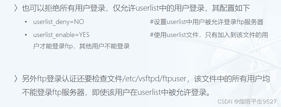 local_enable: 是否允许本地用户(即 linux 系统中的用户帐号)登录 FTP 服务器,默认设置为 NO 允许,本地用户登录后会进入用户主目录;write_enable:是否允许本地用户对 FTP 服务器文件具有写权限,默认设置为 YES 允许;chroot_local_user:是否将所有用户限制在主目录, YES 为启用 NO 禁用;chroot_list_enable:是否启动限制用户的名单 YES 为启用 NO 禁用;chroot_list_file:是否限制在主目录下的用户名单,至于是限制名单还是排除名单,这取决于 chroot_local_user 的值;local_root: 本地用户登录后的默认工作目录;local_umask: 设置本地用户的文件掩码为缺省 022;userlist_enable:此选项激活后,vsftpd 将读取 userlist_file 参数所指定的文件中的用户列表,默认为 NO;userlist_file:userlist_enable 选项生效后,被读取的包含用户列表的文件。默认值是 /etc/vsftpd.user_list;userlist_deny:决定禁止还是只允许由 userlist_file 指定文件中的用户登录 FTP 服务器。userlist_enable 选项启动后才能生效。默认值为 YES,禁止userlist_file 指定文件中的用户登录,同时不向这些用户发出输入口令的指令。NO,只允许 userlist_file 指定文件中的用户登录FTP服务器;