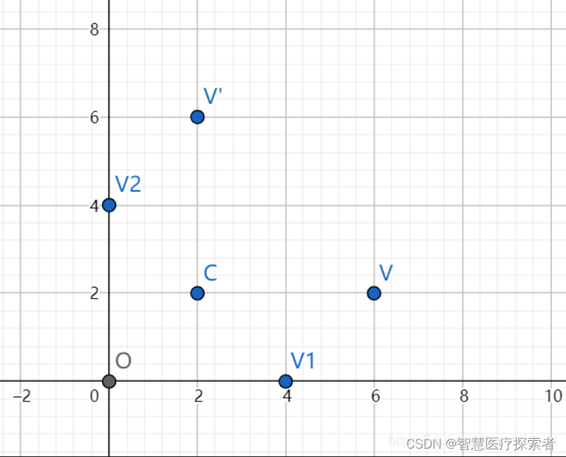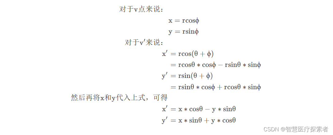 上图中点v在围绕原点旋转θ度之后得到了点v′,我们将坐标点用极坐标的形式来表示可以得到 v(rcosϕ,rsinϕ),所以v′(rcos(θ+ϕ),rsin(θ+ϕ))利用正弦和余弦将其展开可得