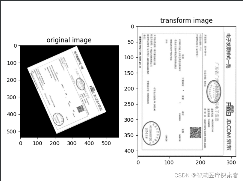 为实现将倾斜的目标矫正过来,首先,我们需要使用轮廓检测等方法获取到目标的4个关键点坐标值;然后利用相应的变换获取到新的4个坐标点;接着利用这4对关键点计算出仿射变换矩阵M;最后应用仿射变换矩阵到目标中即可。步骤如下: