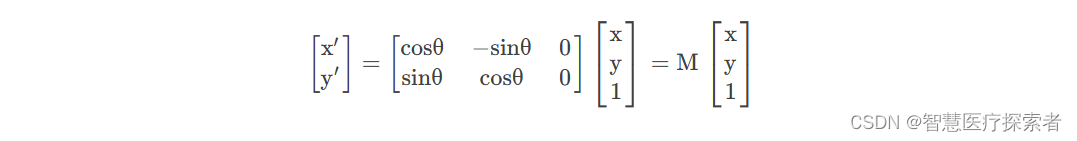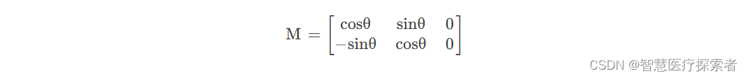 特别注意:我们在建立直角坐标系的时候是以左下角为原点建立的,然而对于图像而言是以左上角为原点建立的,所以我们需要对角度θ进行取反,结合三角函数的特性,M矩阵的表达式如下
