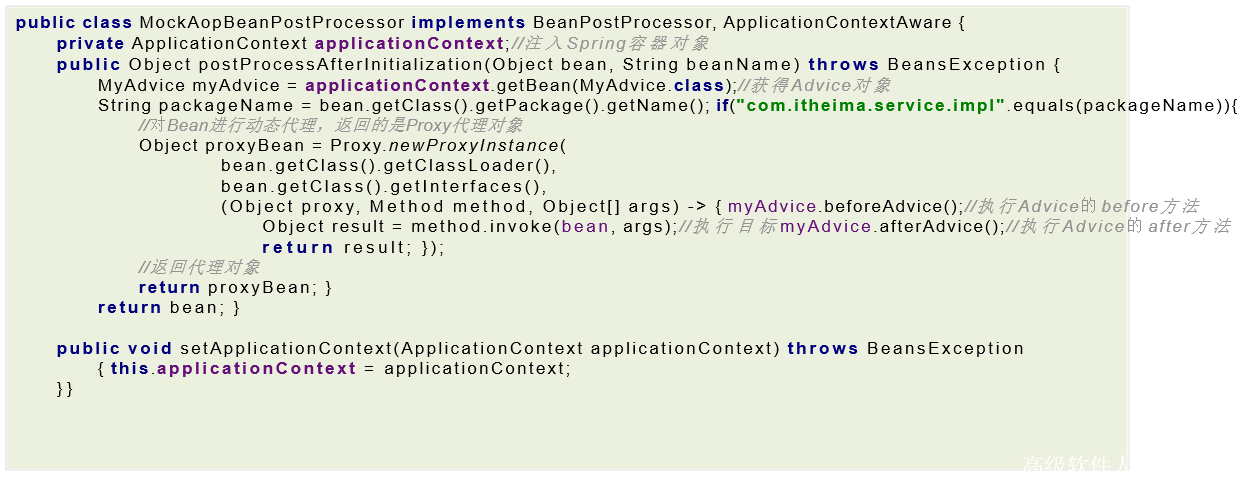 其实在之前学习BeanPostProcessor时,在BeanPostProcessor的after方法中使用动态代理对Bean进行了增强,实际存储到单例池singleObjects中的不是当前目标对象本身,而是当前目标对象的代理对象Proxy,这样在调用目标对象方法时,实际调用的是代理对象Proxy的同名方法,起到了目标方法前后都进行增强的功能,对该方式进行一下优化,将增强的方法提取出去到一个增强类中,且只对com.itheima.service.impl包下的任何类的任何方法进行增强