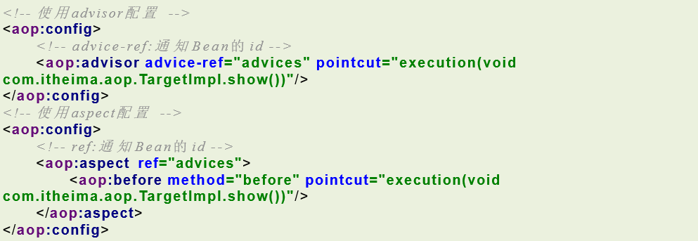 由于实际开发中,自定义aop功能的配置大多使用aspect的配置方式,所以主要讲解aspect的配置,advisor是为了后面Spring声明式事务控制做铺垫,此处了解即可。