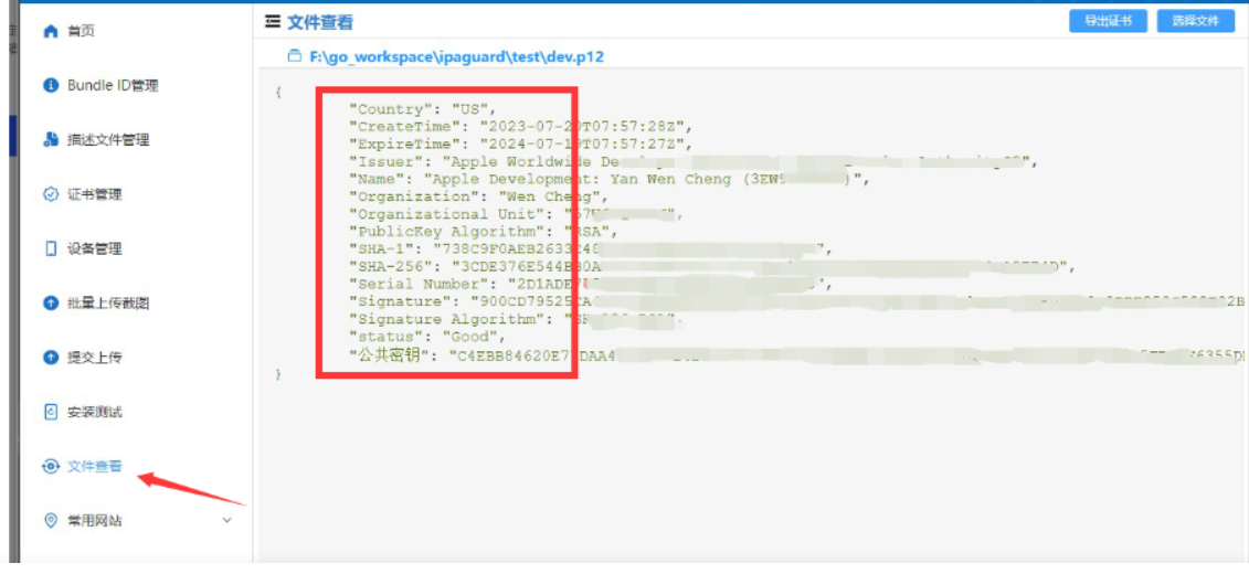 IOS公钥和SHA1签名信息一样登录appuploder-文件页面查看获取,如下图所示!