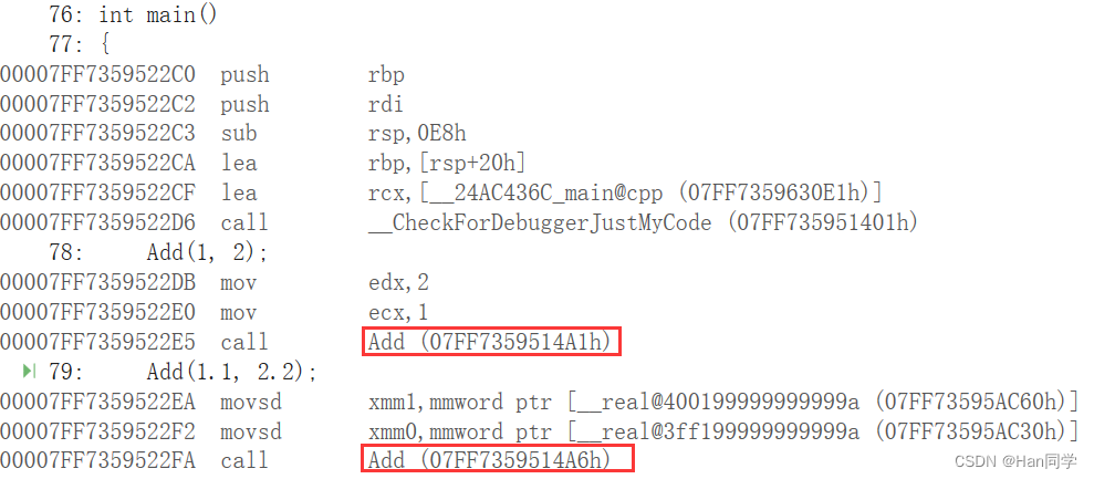 在VS调试中转到反汇编,可以看出Add函数都是通过call Add去调用的,那么链接器怎么区分链接哪个呢?
