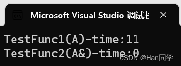 - cout << "TestFunc2(A&)-time:" << end2 - begin2 << endl;