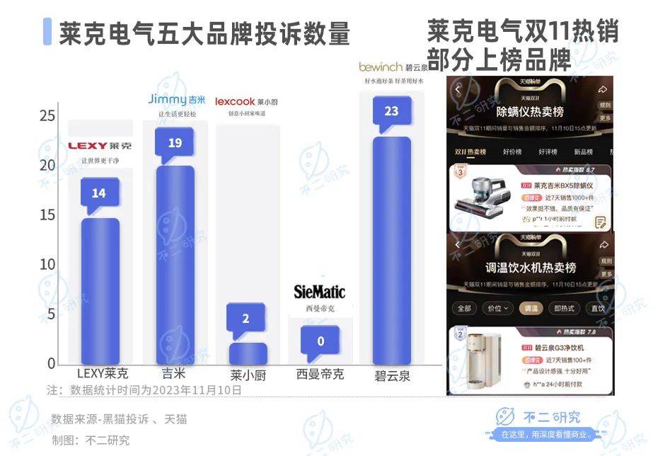 莱克电气的“碧云泉”品牌主营台式智能净水机,对标中高收入人群。截至2023年11月10日,其天猫旗舰店中销量首位产品是天猫调温净水机热销榜第一名,位于行业头部。虽然在天猫和京东旗舰店中,其好评率达99%。但黑猫投诉数据显示,碧云泉净水器相关投诉数量累计23条,多为产品质量及虚假宣传问题。