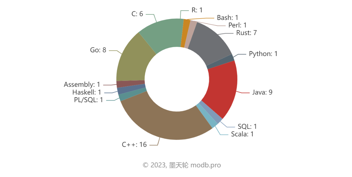目前中国数据库的主流开发语言是 C++,其次是 Java。具体数据如下图所示: