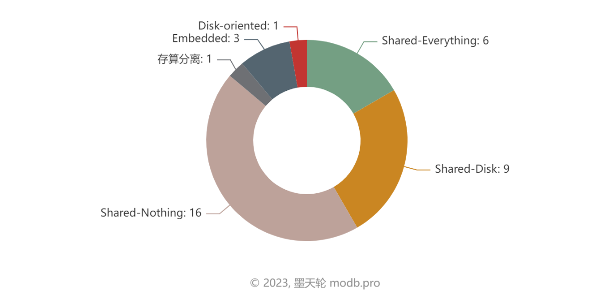 数据库架构与数据库选型息息相关。目前中国数据库产品架构主要有5种,shared-nothing 架构的数据库有16款,其核心思想是各个数据库单元中不存在共享资源,数据处理单元对于各节点完全私有化。具体数据如下图所示: