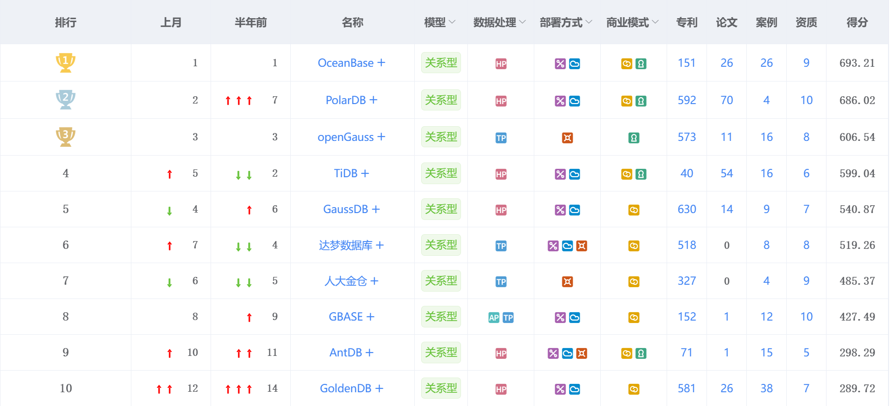 OceanBase 本月得分693.21分,连续一年问鼎榜首。 其诞生于2020年,是一款原生的分布式数据库。近年来,OceanBase 从1.0到4.0经历了4个重要的发展阶段,具备了从大到小的能力,服务了大量金融、运营商、政府公共服务等行业企业。借助开源和技术的优势,其热度一直居高不下,在中国数据库行业占据优势地位。