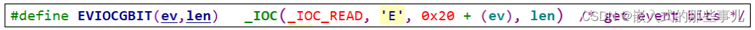 比如要读取输入设备的 evbit 时,ioctl 的 request 要写为“EVIOCGBIT(0, size)”,size 的大小可以由你决定:你想读多少字节就设置为多少。这个宏的 定义如下: