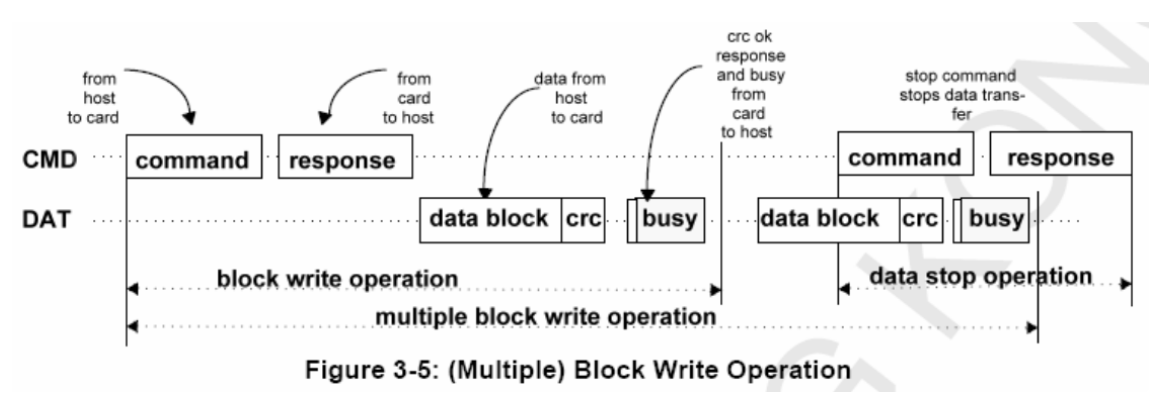 数据传输是以块(Block)为单位。数据块后面为 CRC 校验位。定义了单块和多块传输操作。多块传输通过 Stop 命令(CMD12)来结束。