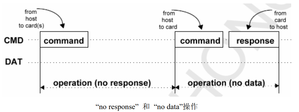 Response:响应由响应的卡驱动,或者同时由连接的卡驱动。作为之前接收到的命令的应答。响应是通过 CMD 信号线串行方式传输。