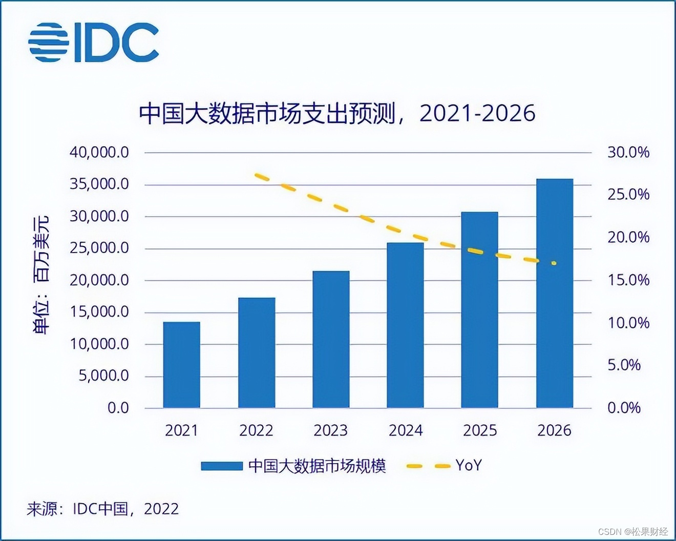 随着数字中国、数据要素、大数据等新一轮政策发布和重大工程落地,以及中小企业项目数字化转型需求的进一步释放,我国大数据市场正迎来新的爆发阶段。IDC预测,我国大数据市场总体IT投资规模将在2026年增至364.9亿美元,实现规模翻倍。
