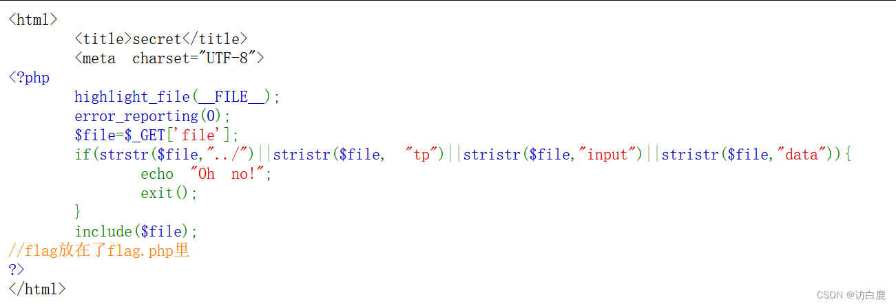如果匹配到其中任何一个,将输出 "Oh no!" 并结束脚本。如果用户提供的 $file 参数通过了过滤器的检查,include($file); 将包含对应的文件