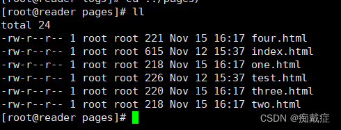 - root pages; # 根目录设置为psges,该目录下有index.html、test.html、one.html、two.html、three.html