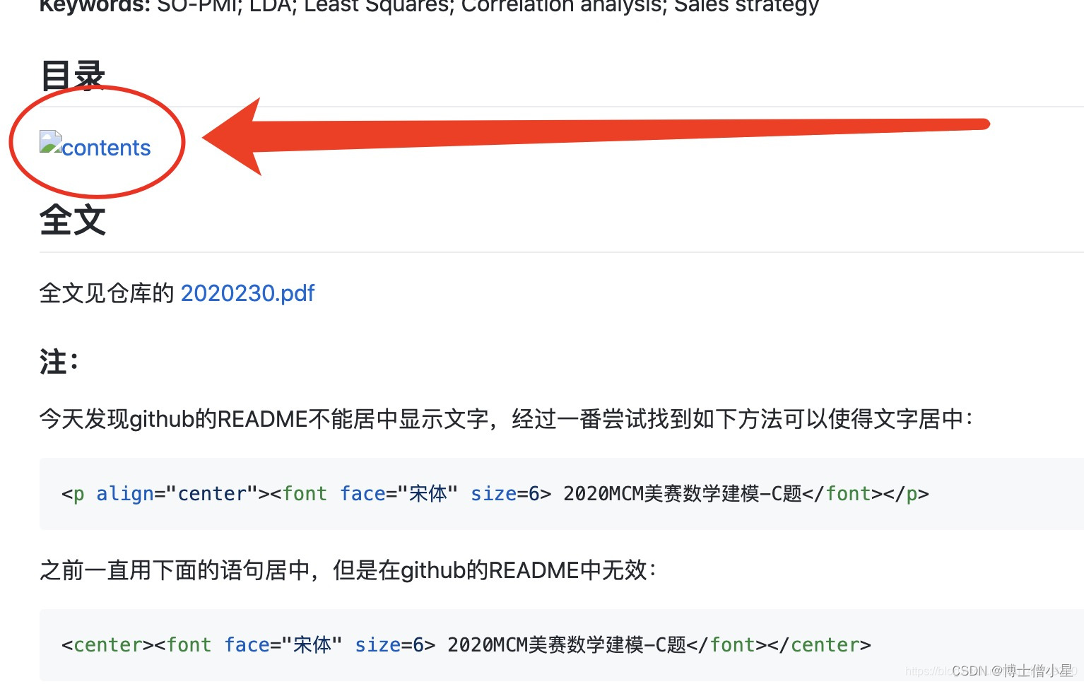其中,contents.pdf是论文的目录页,虽然是pdf格式,但是按照我的经验,LaTeX、markdown都是可以把pdf识别成高清矢量图的,因此在本地的README中,这个目录是会显示的,如下: