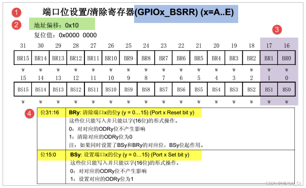 寄存器说明中首先列出了该寄存器中的名称,“(GPIOx_BSRR)(x=A…E)”这段的意思是该寄存器名为 “GPIOx_BSRR” 其中的 “x” 可以为 A-E,也就是说这个寄存器说明适用于GPIOA、GPIOB至GPIOE,这些GPIO端口都有这样的一个寄存器。