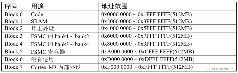 在这8个 Block 里面,有3个块非常重要,也是我们最关心的三个块。Block0 用来设计成内部FLASH,Block1 用来设计成内部 RAM,Block2 用来设计成片上的外设,下面我们简单的介绍下这三个Block里面的具体区域的功能划分。