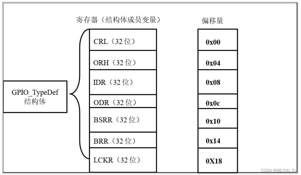 这样的地址偏移与 STM32GPIO 外设定义的寄存器地址偏移一一对应,只要给结构体设置好首地址,就能把结构体内成员的地址确定下来,然后就能以结构体的形式访问寄存器,具体见以下代码: