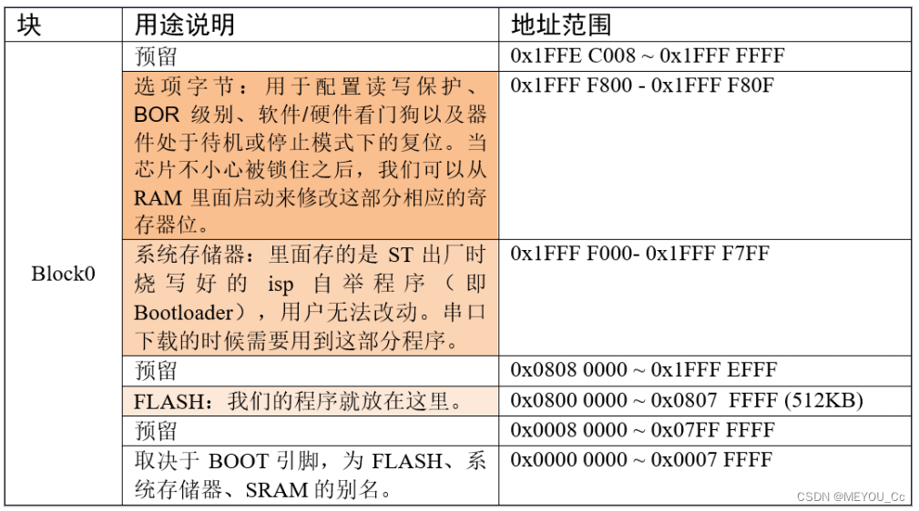 Block0 主要用于设计片内的 FLASH,我们使用的 STM32F103ZET6 的 FLASH 都是512KB,属于大容量。要在芯片内部集成更大的 FLASH 或者 SRAM 都意味着芯片成本的增加,往往片内集成的 FLASH 都不会太大。Block 内部区域的功能划分具体见表格存储器 Block0 内部区域功能划分。