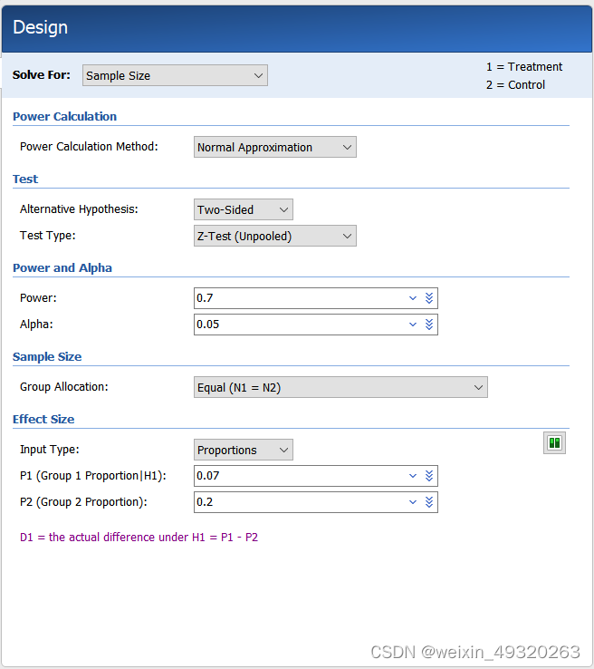 选择:Tests for two proportional,alpha对应α=0.05,power对应1-β=0.3。P1处理组样本发生率=0.07,P2对照组样本发生率=0.2。
