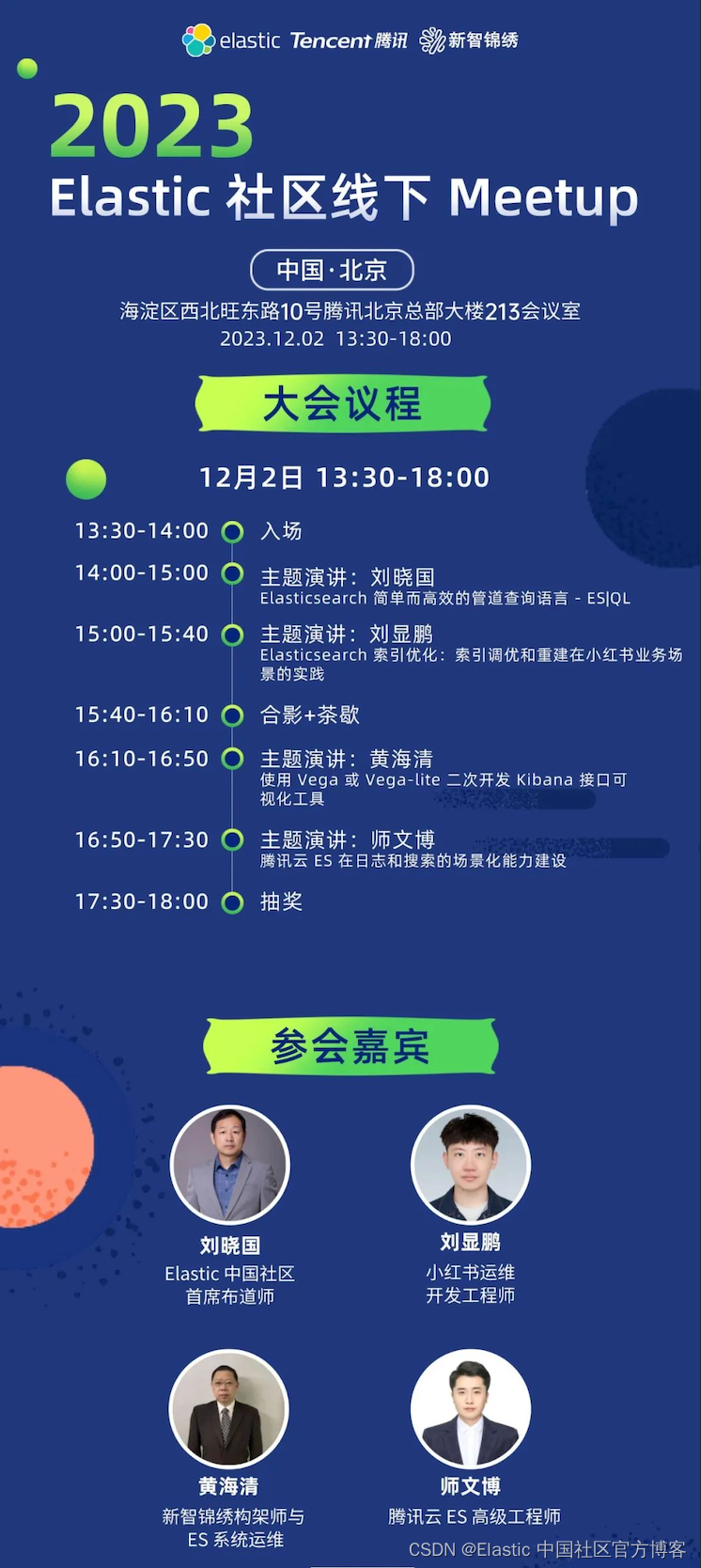 《2023 Elastic Meetup 北京站》活动将于 12 月 2 日下午 1 点 30 在北京市海淀区西北旺东路10号腾讯北京总部大楼213会议室举办,届时将有行业专家及知名企业分享他们在 Elasticsearch 应用中的经验与观点,带来最前沿的技术分享与思想碰撞。